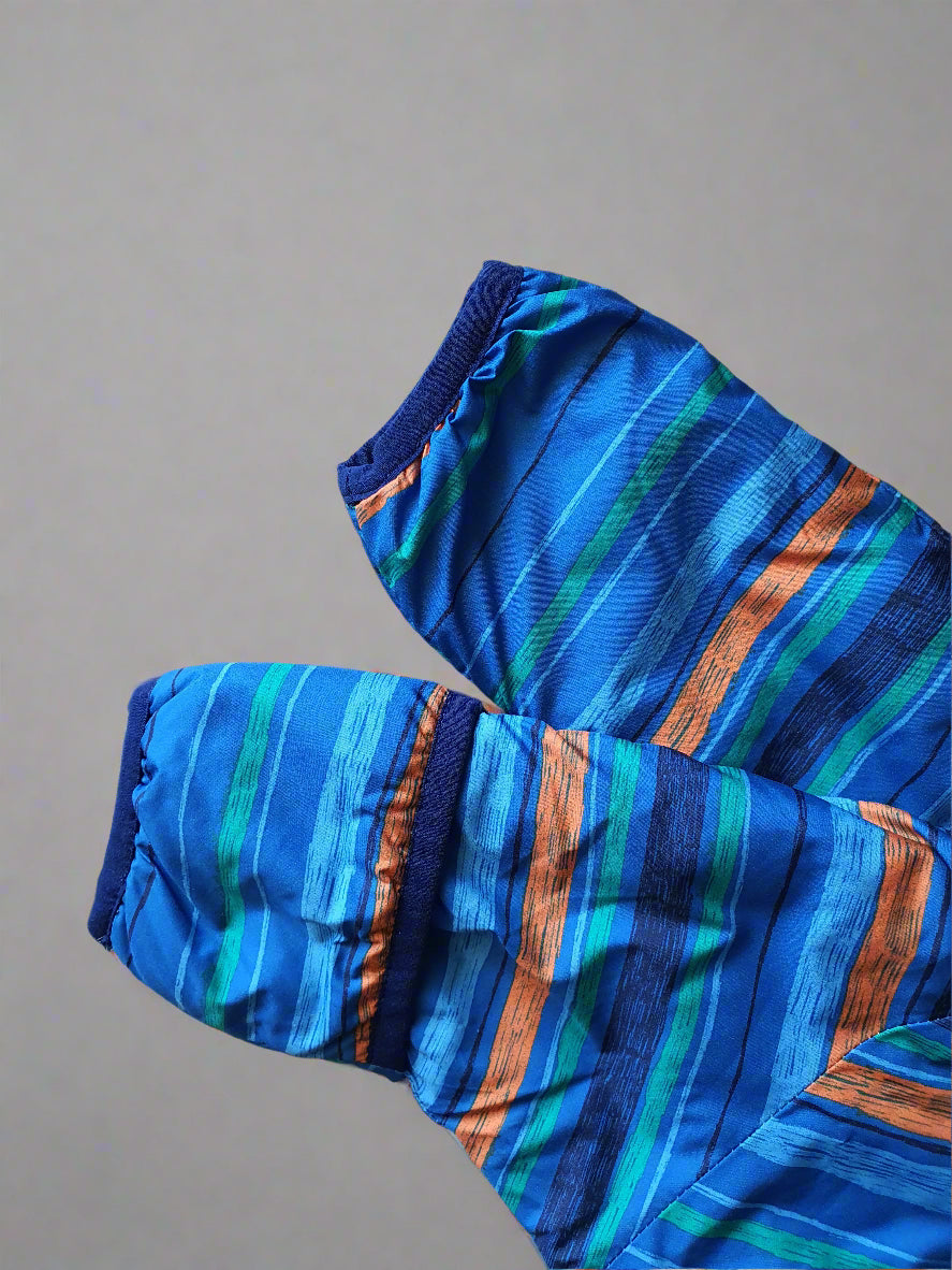 Keep your little one snug in this vibrant MEC winter suit! Featuring a colorful striped pattern in blue, green, and orange, this all-in-one design includes built-in feet and palm coverings for extra warmth. With a hood and full-length zipper for easy dressing, this suit is perfect for chilly outdoor adventures. Stay stylish and toasty all winter long!